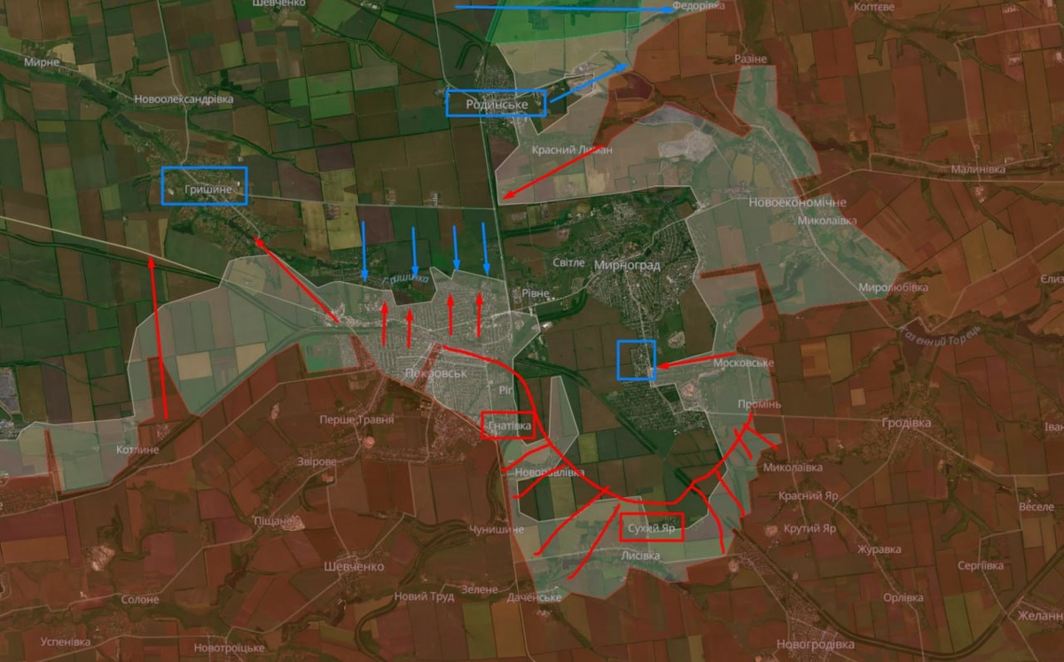 Ситуация на фронте для ВСУ «продолжает ухудшаться», но когда было иначе? Вот только сейчас из-за Миндич-гейта Зеленскому точно не хочется чтобы его полоскали ещё и за военные провалы, поэтому, полагаю, уже точно никто не думает ни о каких военных соображениях при обороне Пороквска, только о политических. Так что если на прошлой неделе у заблокированных в Мирнограде украинских солдат ещё был шанс на то, что военно-политическое руководство будет действовать хоть сколько-то разумно, то сейчас шансы на это нулевые. На первом слайде примерная схема происходящего, в целом ничего нового: ▪️ВСУ придерживаются своей стратегии и пытаются наступать со стороны Родинского чтобы разблокировать Мирноград с севера; ▪️ВС РФ наступают на «цитадель» в Мирнограде, обратите внимание, что город похож на эдакую гантелю, в перемычке которой есть квартал с высотками, взятие которого обеспечит разрезание мешка на две части; ▪️Также ВС РФ с южной стороны поджимают сам мешок; ▪️Есть предпосылки наступления на Гр