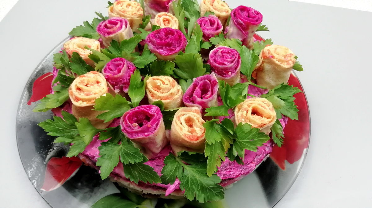 Здравствуйте,друзья!Хочу предложить рецепт Праздничного салата Селёдка под шубой/Изысканный Салат "Букет роз"!УДИВИТЕ СВОИХ ГОСТЕЙ!Легендарный салат в новой подаче! Салат "Букет роз" потрясающе красивый салат, который похож на букет красивых роз.Готовится он из самых обычных продуктов.Чтобы значительно сократить время приготовления, советую овощи отварить накануне.Очень рекомендую приготовить такой салат, уверена, гости будут приятно удивлены. И так начинаем,лук очистить и мелко нарезать,нужно замариновать Малосольную сельдь разделайте на филейные рыбные кусочки без костей и кожи Второй слой Затем следует слой моркови Свеклу натереть на крупной терке. Немного свеклы убираем для начики роз Основа для букета готова! Начинка для красных роз В свеклу добавьте эти ингредиенты, хорошо перемешайте. Для оранжевых роз Все хорошо перемешать Выпекаем обычные блины.Блинчики должны получиться не слишком тонкими, чтобы в дальнейшем рулеты из них хорошо держали форму и свою начинку Скрутите блинчики