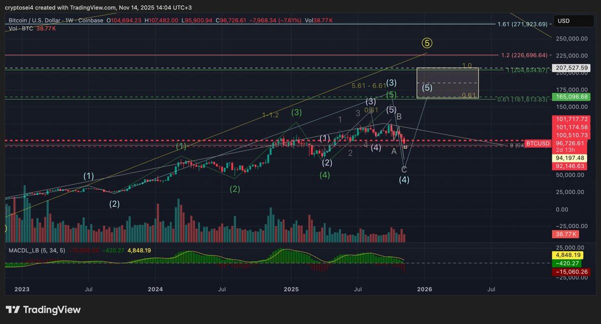Два лагеря. Один рынок. И тишина перед решением цикла Инвесторы, сегодня поделюсь тем, что обычно оставляю внутри клуба. В закрытом разборе я прошёл всю разволновку подробно, с таймингом, со связью волатильности и структуры. Если вы из Академии или Автотрейдере — обязательно посмотрите полное видео: там ход мысли, там контекст. Здесь дам суть. Чтобы вы понимали, где мы стоим и почему рынок сейчас похож на фразу: «ещё один вдох — и всё станет понятно». Сейчас есть два лагеря. Первый говорит: «Пик уже был. 126 тысяч в октябре — это финальная пятая волна всего цикла. Бычка закончилась. Сейчас идёт большая четвёртая вниз, и ждать зимнего ралли уже не стоит. Новый старт — только в 2026-м. Но это неточно». Эту версию я понимаю, но не разделяю. В ней слишком много тишины, и она плохо вяжется с фундаменталом, который мы видим последние недели: центробанки, суверенные фонды, геополитика, ускорение принятия. Второй лагерь — мой. Здесь картина другая. Тройка закончилась в октябре на 126 тыся