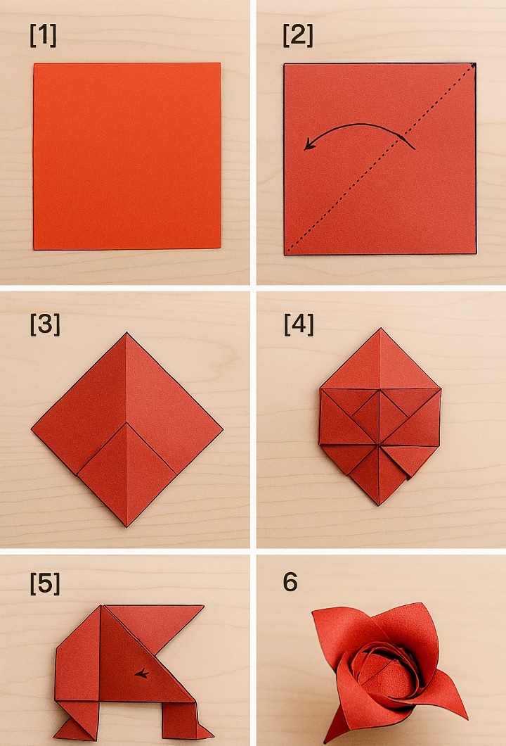 Я люблю розы. В них есть что‑то особенное: нежность, сила, грация. И когда я складываю розу из бумаги, я будто создаю символ чувств, которые невозможно выразить словами. Это не просто фигурка — это жест, момент, настроение. Я начинаю с квадратного листа бумаги. Обычно беру красный — он сразу настраивает на нужную волну. Но иногда экспериментирую: розовая роза — нежная, белая — утончённая, синяя — загадочная. Я кладу лист на стол, разглаживаю его ладонью. Он гладкий, ровный, как чистый холст. Я складываю лист по диагонали, затем по другой. Потом — по горизонтали и вертикали. Получается сетка из сгибов. Это основа, как каркас у скульптуры. Каждый сгиб — как дыхание. Я делаю его медленно, прижимаю пальцем, чтобы линия была чёткой. Теперь я складываю углы к центру. Получается квадрат с загнутыми уголками. Он уже напоминает бутон. Я чувствую, как бумага начинает «жить». Я загибаю углы ещё раз — внутрь. Получается маленький квадрат. Он плотный, компактный, как закрытая роза. Самое волшеб