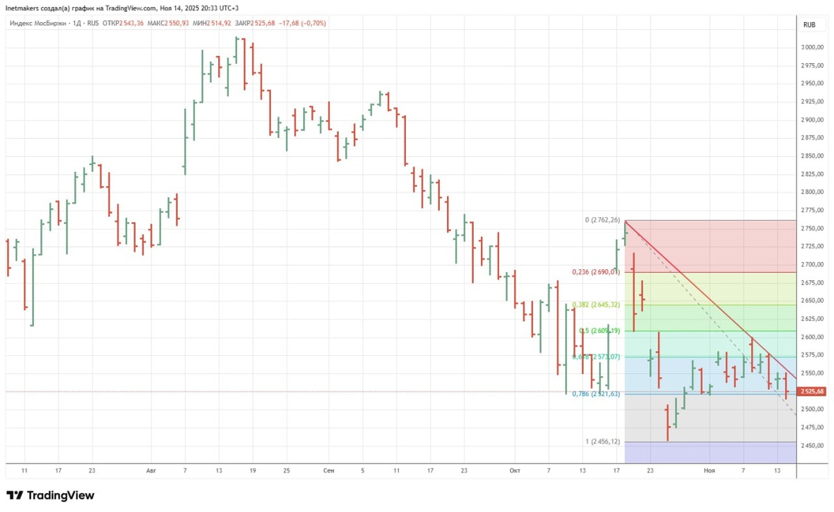 ❗️14 ноября российский фондовый рынок завершил рабочую неделю снижением, индекс МосБиржи подешевел на 0,7% до уровня 2525,68