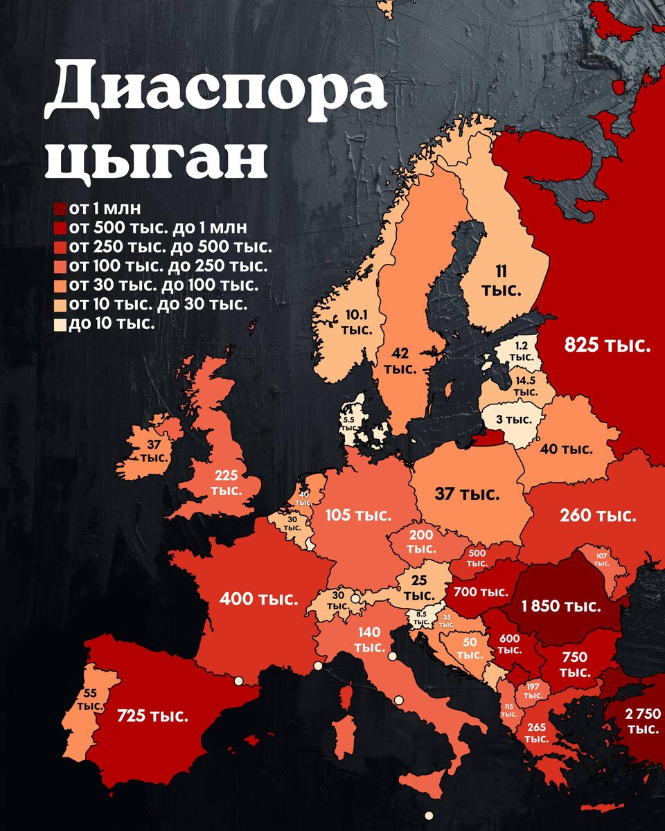 Карта цыганского населения в странах Европы 1. Турция🇹🇷 - 2 750 тыс. 2. Румыния🇷🇴 - 1 850 тыс. 3. Россия🇷🇺 - 825 тыс. 4. Болгария🇧🇬 - 750 тыс. 5. Испания🇪🇸- 725 тыс. #карты #этнография #цыгане