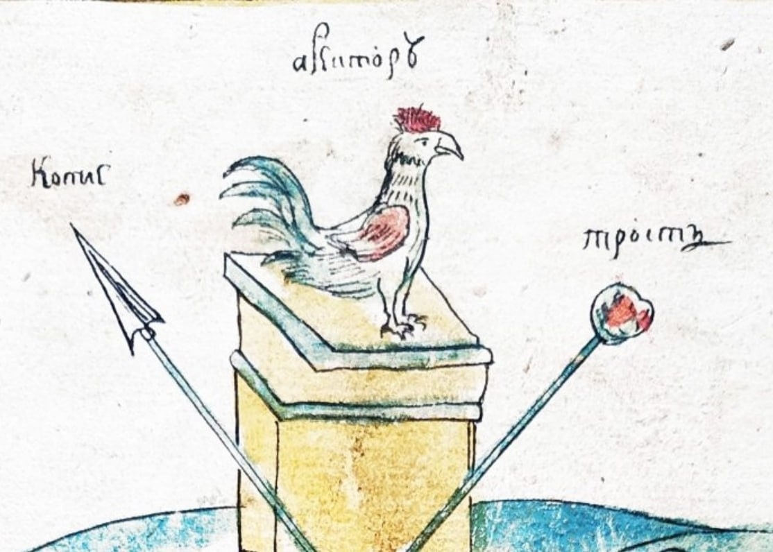 Петухи в древнерусских рукописях XIV-XVIII вв. Благодаря евангельскому рассказу об отречении Петра, петух часто изображается на фресках, иконах и миниатюрах Страстного цикла (4), включаясь и в перечень орудий страдания Христа (1). Из характерных свойств петуха в древнерусской литературе описывается его драчливость и похотливость. В "Сказании о Куре и Лисице" (7) "преподобная мать" лиса предлагает петуху покаяться в этих прегрешениях, а затем съедает. Утреннее пение петуха, который будит добрых христиан, воспринимается как его положительное свойство. В "Сказании о всей твари" (5, 8) описывается огромный петух, которому "море по колено". Он кричит "Кукареку", что переводится как "Светодавче Господь, подай свет миру!", тогда его слышат все петухи на земле и начинают петь в ожидании солнца.
