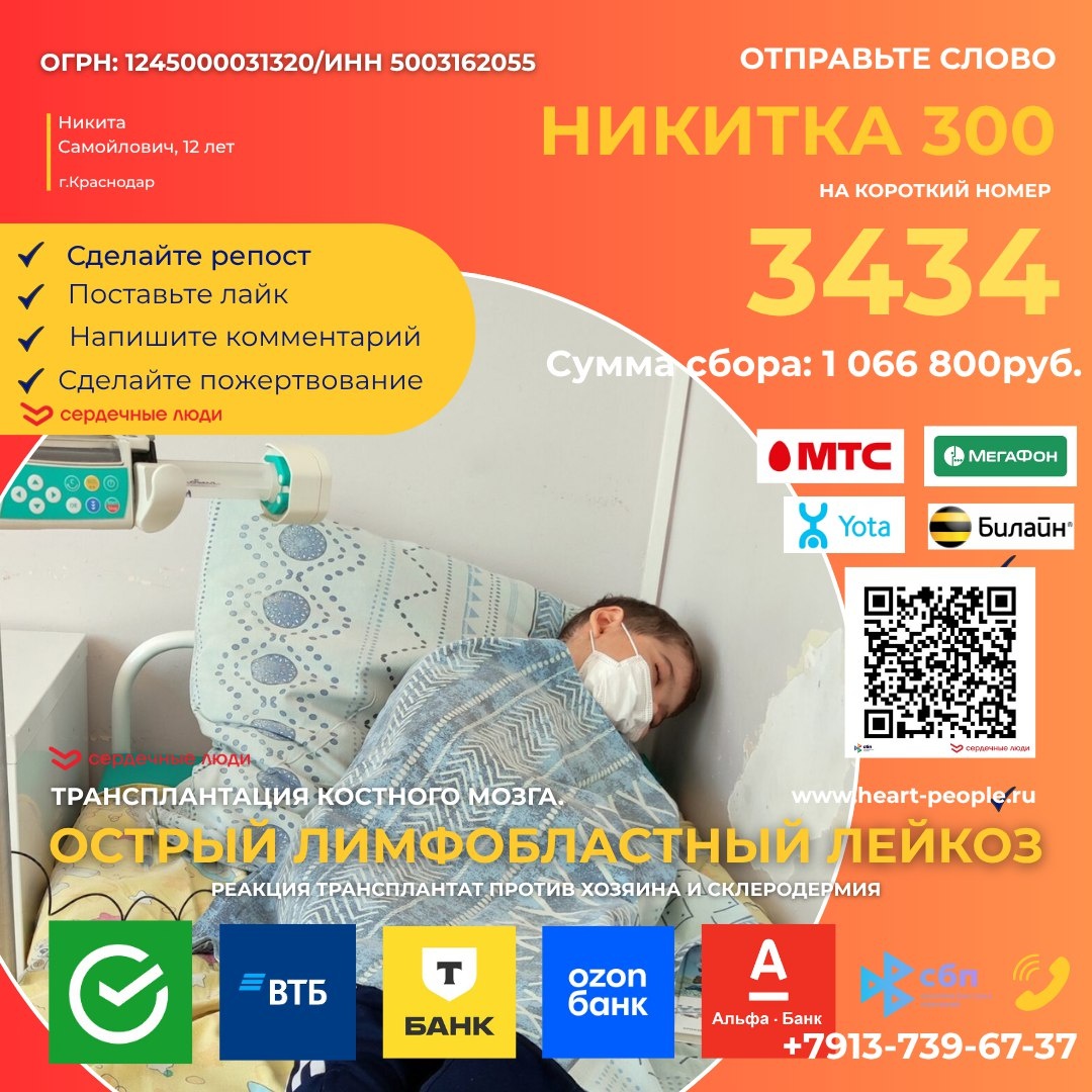 Закрыть сбор помощи для Никиты – это не просто собрать необходимую сумму. Это значит дать ему понять, что он не один. Что простые люди, незнакомые с ним лично, готовы протянуть руку помощи. Что мир не равнодушен к его боли. Мы не можем позволить, чтобы Никита почувствовал себя брошенным. Особенно после того, как его оставил родной отец. Мы должны показать ему, что есть другие люди, способные на сострадание и поддержку. Давайте вместе закроем этот сбор! Давайте вместе вырвем Никиту из лап реанимации и вернем ему надежду на полноценную жизнь! Каждый ваш рубль, каждое ваше доброе слово – это кирпичик в фундамент его будущего. 📌 Вы можете сделать перевод со своего расчетного счета на счет БФ «СЕРДЕЧНЫЕ ЛЮДИ». Реквизиты для перечисления денежных средств: ОБЩЕСТВЕННО ПОЛЕЗНЫЙ БЛАГОТВОРИТЕЛЬНЫЙ ФОНД "СЕРДЕЧНЫЕ ЛЮДИ" ИНН организации: 5003162055 КПП организации: 500301001 Номер счёта: 40701810724971000001 БИК банка: 044525411 Корреспондентский счёт: 30101810145250000411 Банк: ФИЛИАЛ "ЦЕН