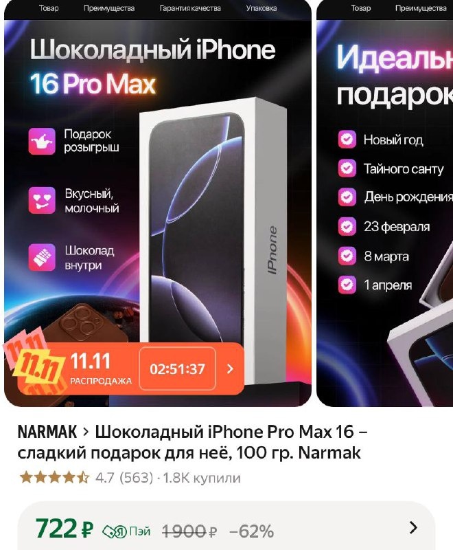 Шоколадный iPhone Pro Max 16 – сладкий подарок для неё, 100 гр. Narmak https://market.yandex.ru/cc/82KW7d Прикольно для розыгрыша😃 ⭐️NORTME-41-AF - минус 2000₽ на один любой заказа от 8000₽ (для новых пользователей) ⭐️BER103-AF — минус 100₽ на один любой заказ от 5000₽ ✅ Подписаться 🔣 Бот с промокодами