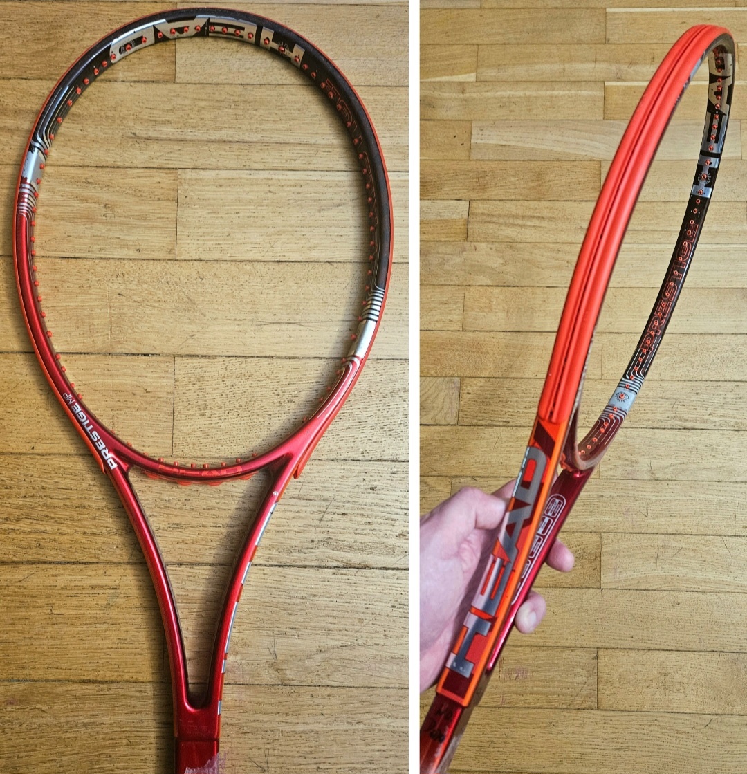 И к этой дате инженеры Head подготовились как надо. На тот момент они уже начали выпускать в ритейл новую модификацию Prestige Pro. Если, начиная с 1987 года и на долгое время это название ассоциировалось с ракетами с головой 89,5 и со струнной формулой 18/20, то в начале 10-ых нового века это уже была фантазия на тему TK57 с расструновкой 16/19. Но к юбилею Кулибины из Кеннельбаха, помимо Prestige Pro (с Pro Stock кодом TGT293.1) выпускают молд, который удивительно похож на TK57. Это и был праздничный TGT293.2 18/20 в пейнтджобе IG Prestige MP: