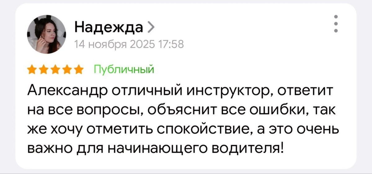 Надежда, спасибо за отзыв! 😊 Очень рад, что вам понравился наш урок, и вы почувствовали себя спокойно и уверенно за рулём. 🚗💨 Для всех, кто тоже хочет научиться уверенно и безопасно водить автомобиль с АКПП в Костроме, напоминаю, что запись на занятия доступна онлайн. У меня как раз осталось несколько свободных окон в эти выходные: · Воскресенье (16 ноября): 14:30. Буду рад помочь и вам обрести уверенность на дороге! Записывайтесь на удобное время прямо здесь: https://dikidi.net/1829681