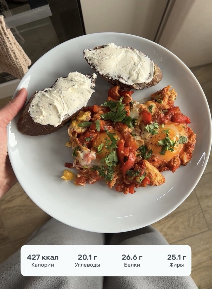 — зира, соль, перец чёрный молотый Подготовить все ингредиенты. Разогреть в сковороде растительное масло. Выложить в сковороду лук, обжарить 1-2 мин, затем выложить перец, обжарить 2-3 мин, затем выложить помидоры и тоже обжарить 2 мин. В получившуюся смесь овощей добавить яйца, сохранив желтки целыми. Раздавить пальцами зиру, посолить и поперчить по вкусу. Жарить около 5-7 минут на небольшом огне. Белки должны схватиться, а желтки остаться жидкими. Готовую яичницу посыпать рубленой кинзой. Подавать лучше с чесночным багетом и творожным сыром. Можно добавить так же нарезанный сыр сиртаки в готовое блюдо. Приятного аппетита 😋 #шакшука #рецепт #рецептсяйцами #нутрициолог #тренер #рацион