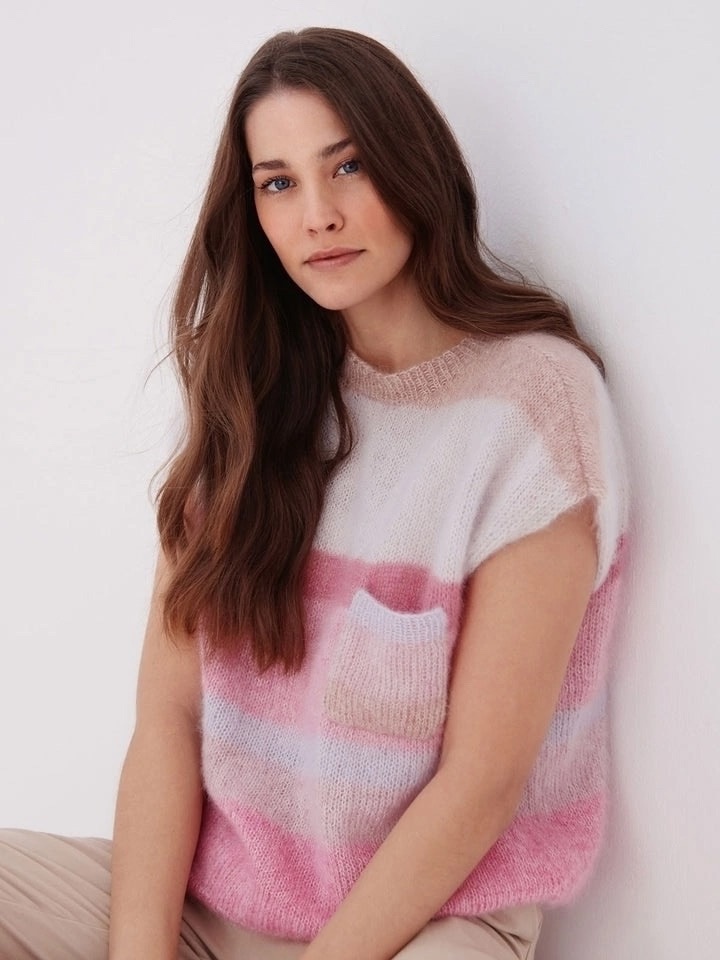 Вам потребуется: 75 (100-100-125) г белой суро-вой (цв. 52), 25 (25-50-50) г цвета розового дерева (цв. 74), 25 (25-50-50) г нежно-лиловой (цв. 87), 50 (75-75-100) г цвета лиловой (цв. 152), 25 (25-50-50) г цвета фуксии (цв. 162) и 25 (50-50-75) г цвета фуксии (цв. 172) пряжи SilkHair (70% мохера суперкид, 30% шелка, 210 м/25 г) фирмы Lana Grossa, прямые спицы № 3.5 и № 4, короткие круговые спицы № 3.5.