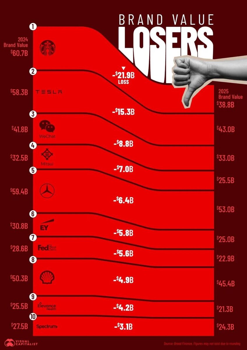 Starbucks летит на самое дно. За год стоимость бренда упала на $21,9 млрд и заняла первую строчку в антирейтинге Brand Finance. За ней, кстати, идут Tesla и WeChat. Главная проблема Starbucks, кто бы мог подумать, — зумеры. Ну а если быть вернее, у сети просто нет предложения для них. А это сейчас самая прибыльная аудитория. Ну мы-то все прекрасно понимаем, что проблема в отвратительном кофе… @lobushkin