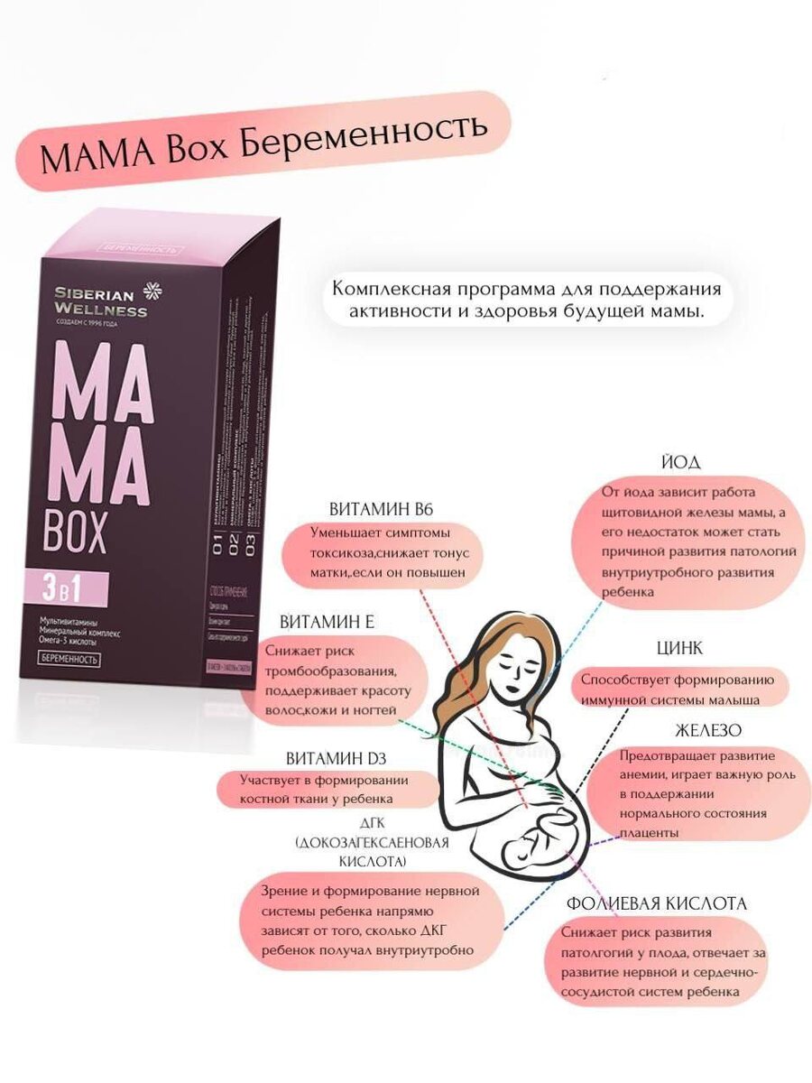 MAMA Box Беременность 💎витамин Е (dl-альфа-токоферола ацетат), усилен другими жирорастворимыми витамин А пальмитат, витамин К1, витамин D3. Натуральный состав Более 50% ингредиентов натурального или органического происхождения, включая высокоусвояемую форму витамина В9 (метилфолат). Сертифицированный продукт Соответствует рекомендациям для беременных НИИ питания РАМН. Ценная ДГК Омега-3 для развития мозга, зрения и нервной системы. https://ru.siberianhealth.com/ru/shop/catalog/product/501681/?referral=2625479324 PS mama box можно не только мамам. Это хороший витамино-минеральный комплекс для любого