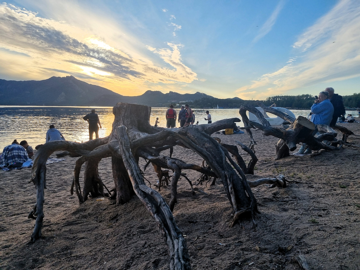 Потом, сидя на пляже, мы все вместе любовались, как солнце уходит за горы, оставляя последние блики на зеркальной глади озера.