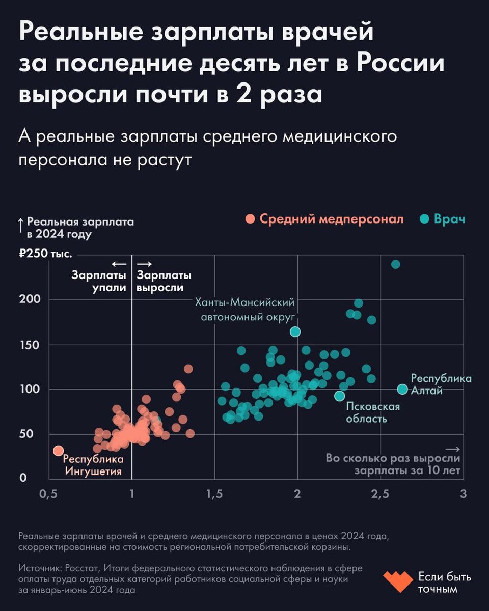 За последние десять лет реальные зарплаты врачей в России выросли почти вдвое — с 64 до 121 тысяч рублей. В большинстве регионов рост составил 1,5–2 раза. Исключение — Ингушетия, где доходы врачей увеличились лишь в 1,2 раза. Но у среднего медперсонала ситуация иначе: реальные зарплаты не растут, а снижаются. В среднем по стране они уменьшились с 64 до 61 тысячи рублей. В 44 регионах рост едва достиг 10–30%, а в 40 — падение. Даже в Москве реальные зарплаты медсестер снизились на 10%, тогда как у врачей за то же время выросли в 1,6 раза. 🔸Низкие доходы ведут к высокой текучке кадров. Каждая пятая медсестра увольняется уже в первый год работы. Самая высокая текучка — в Тыве (42%), на Алтае (41%) и в Калмыкии (34%). Для сравнения, в среднем по стране — около 15%. По данным выборочного наблюдения трудоустройства выпускников, среди тех, кто окончил программы подготовки среднего медперсонала в 2016–2020 годах, 65% хотели сменить работу. «Значение сестринской профессии в России очень недооц