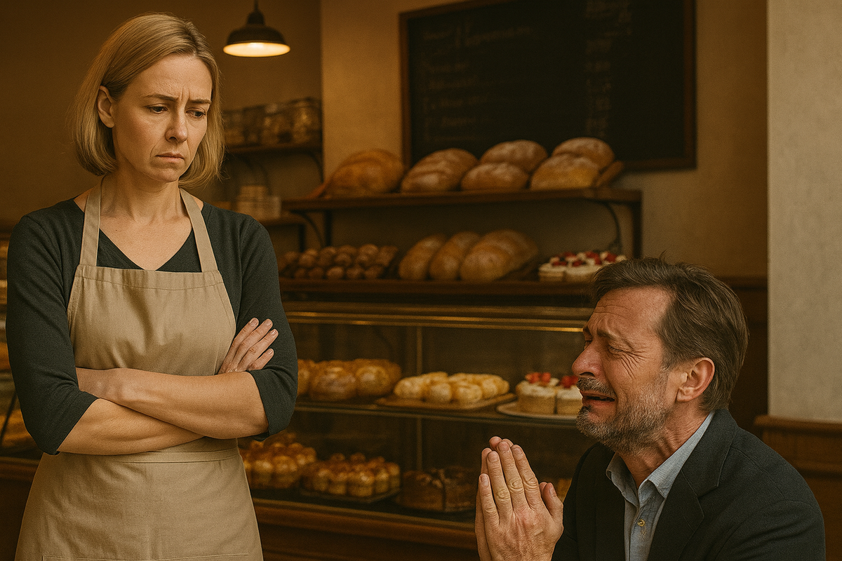 Не метафорически. Реально. На пол. В кондитерской, где пахло корицей и кофе, посреди белого плиточного пола, который Даня укладывал своими руками. Мужчина, который год назад выталкивал её на лестницу с чемоданом, сейчас стоял на коленях и смотрел снизу вверх.