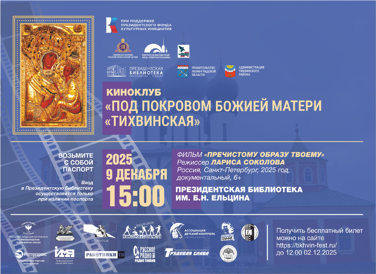Дорогие друзья, приглашаем Вас на Киноклуб VI Кинофестиваля «Под Покровом Божией Матери «Тихвинская» в Президентской библиотеке имени Б.Н. Ельцина. Киноклуб пройдет 9 декабря 2025 г., начало в 15.00 в рамках проекта «Киноклуб Президентской библиотеки» «Пречистому образу Твоему», режиссер Соколова Лариса. Фильм посвящен возвращению Чудотворного Образа Пресвятой Богородицы и рассказывает об удивительной истории величайшей святыни мира, её обретении, скитаниях и пути домой. Герои фильма – непосредственные участники и свидетели возвращения иконы, на чьи жизни чудесным образом повлияла встреча с Образом. Перед зрителем предстанут хроникальные кадры возвращения иконы. Это история о Вере, о силе духа, о неразрывной связи поколений, и о том, как величайшии Святыни способны объединять людей и возвращать надежду. Фильм документальный. Россия. 6+ Перейти к регистрации !!! Обращаем внимание, что вход в Президентскую библиотеку осуществляется только по предварительной регистрации и при наличии пас
