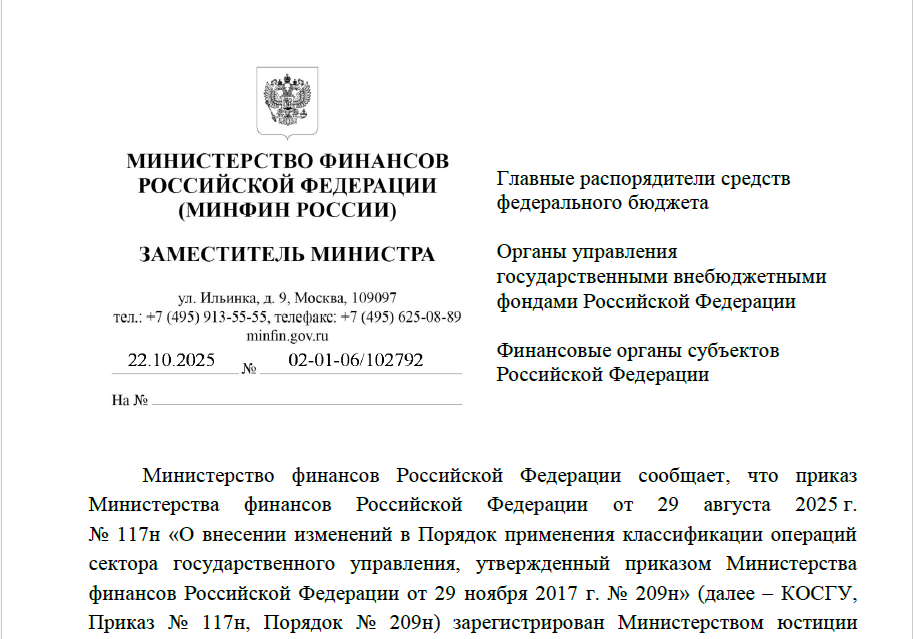 На официальном сайте Минфина России в разделе нормативных правовых актов и методических рекомендаций по бюджетной классификации размещено Письмо от 22.10.2025 № 02-01-06/102792 «О приказе Минфина России от 29.08.2025 № 117н». В письме сообщается о внесении изменений в Порядок применения классификации операций сектора государственного управления (КОСГУ) № 209н.
