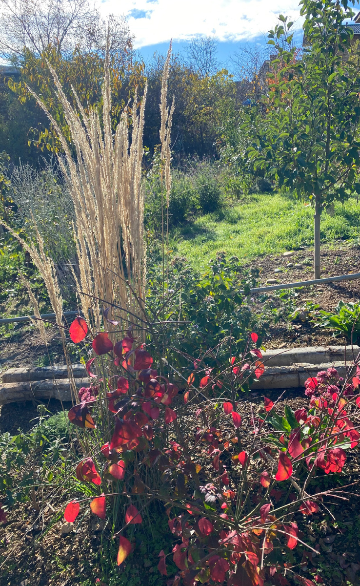 16.11.25 Наш южный ноябрь в текущем году спокойно можно назвать сочным и ярким. Плюсовая температура позволяет некоторым растениям все ещё зеленеть. В то же время, другие растения окрашиваются в осенние краски. Процессы происходят одновременно. Особенно жизнерадостно в это время смотрятся вечнозеленые растения — кустарники, почвопокровные, хвойные. Ещё цветут розы. Притащила в сад цветущую деленку колокольчика, который увидела на сезонном рынке. Неделю как посадила, сидит живой и цветёт. У меня несколько лет растёт похожий, только он ещё ни разу не цвёл осенью. Кустик руэллии, который я забрала на зиму на лоджию домой, адаптировался и цветёт. Теперь смотрю на тот куст, который остался на улице, чтобы забрать так же. Корневая у руэллии места много не занимает. Её легко пересаживать из грунта в горшок. Молодила разных оттенков в это время года теряют цвет и выглядят практически одинаково зелёными. Например, это молодило зимой, ближе к весне приобретет насыщенный красновато-бордовый