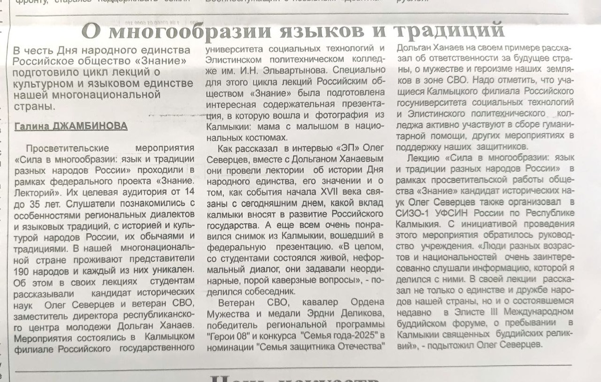 «О многообразии языков и традиций» «ЭЛИСТИНСКАЯ ПАНОРАМА» - о проведённом мною цикле лекций Российского общества «Знание» «Сила – в многообразии», посвященных Дню народного единства, в Калмыцком филиале РГУ социальных технологий , Элистинском политехническом колледже имени И.Н.Эльвартынова , ФКУ СИЗО-1 УФСИН России по Республике Калмыкия . Благодарю уважаемую Галину Нальджаевну Джамбинову, Заслуженного работника культуры Республики Калмыкия, ветерана журналистики Калмыкии за лаконичный и при этом столь содержательный материал 🤝! Пример того, когда опыт и радение за качество своего труда дают образцовый результат. И руководство, вцелом редакцию газеты благодарю за взаимодействие и информационную поддержку 🤝👍! #РОЗнание #Знание #Калмыкия #ОлегСеверцев #4ноября #ДеньНародногоЕдинства #держимкурс и #работаем #ЭлистинскаяПанорама