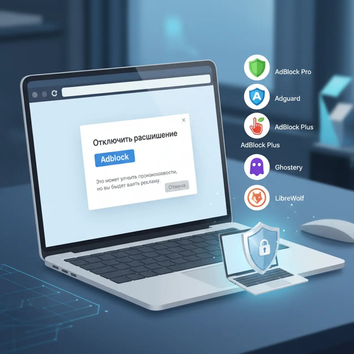 Adblock — общее название расширений для блокировки рекламы в браузере. Часто его отключают, когда расширение мешает работе сайтов или нужно временно разрешить рекламу. Ниже — пять реальных альтернатив и советы, как перейти с Adblock на более подходящую защиту от рекламы и трекеров. AdBlock Pro — простое расширение, которое блокирует баннеры, всплывающие окна и Flash‑элементы. Легко настраивается и имеет список исключений для любимых сайтов. Подойдёт тем, кто хочет быстрый и понятный блокировщик с минимальной настройкой и возможностью исключать сайты. Adguard — не только расширение, но и целый набор фильтров: блокировка рекламы, защита от фишинга и приватность. Обеспечивает более глубинную фильтрацию по сравнению с простыми плагинами. Рекомендуется пользователям, которым важна безопасность и фильтрация на уровне сети (подходит тем, кто готов настроить дополнительные фильтры). AdBlock Plus — зрелое расширение с поддержкой подписок на фильтры и простым управлением. Хорошо работает в Firef