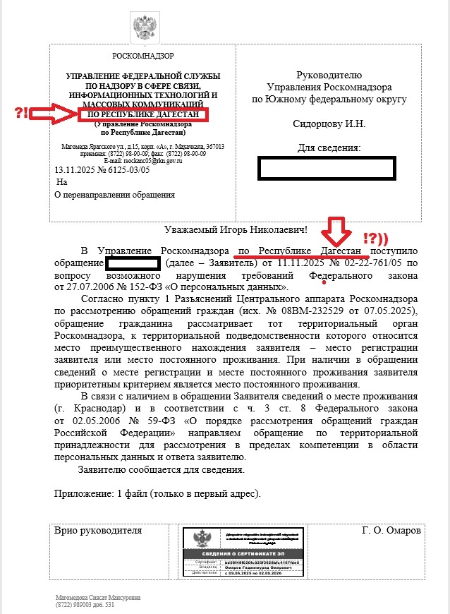 1. Каким образом, моя первоначальная жалоба, поданная в установленном порядке, изначально оказалась в Управлении Роскомнадзора по Республике Дагестан(!?), если уже при её первичной регистрации было очевидно, что я проживаю в Краснодаре(!!?) (т.е. в зоне ответственности Управления по ЮФО)?