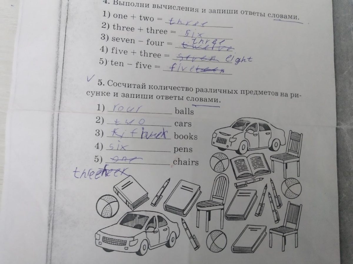 Это все та же пик-пикающая девочка. Изучали мы с ней числительные. И изучаем. И продолжим изучать. И не знаю, когда изучим и изучим ли вообще. Ох, как в русском не хватает Present Perfect Continuos. ) С другой стороны, вот наглядный пример его употребления. Показываю домашнее задание девочки. Виждь и внемли, уважаемый читатель! ) Итак, смотрим на упражнение 1. В частности, давайте обратим внимание на третий пример. Девочка явно приняла минус за плюс. Видите, там изначально написано 12? Причем она даже сложила неправильно. ( 7+4=11. Четвертый пример. Пять плюс три. У нее почему-то семь. Пятый пример. 10-5=15. Тут тоже плюс и минус перепутаны. И еще 15 неправильно написано. Напоминаю, это домашнее задание. У нее есть под рукой тетрадь, учебник, словарь, великий интернет. И если я допускаю, что числительные можно перепутать – они все же по-английски написаны, то плюс и минус-то знаками изображены. ))) И вроде бы подобная информация не должна быть чем-то неизведанным для ученицы третьего