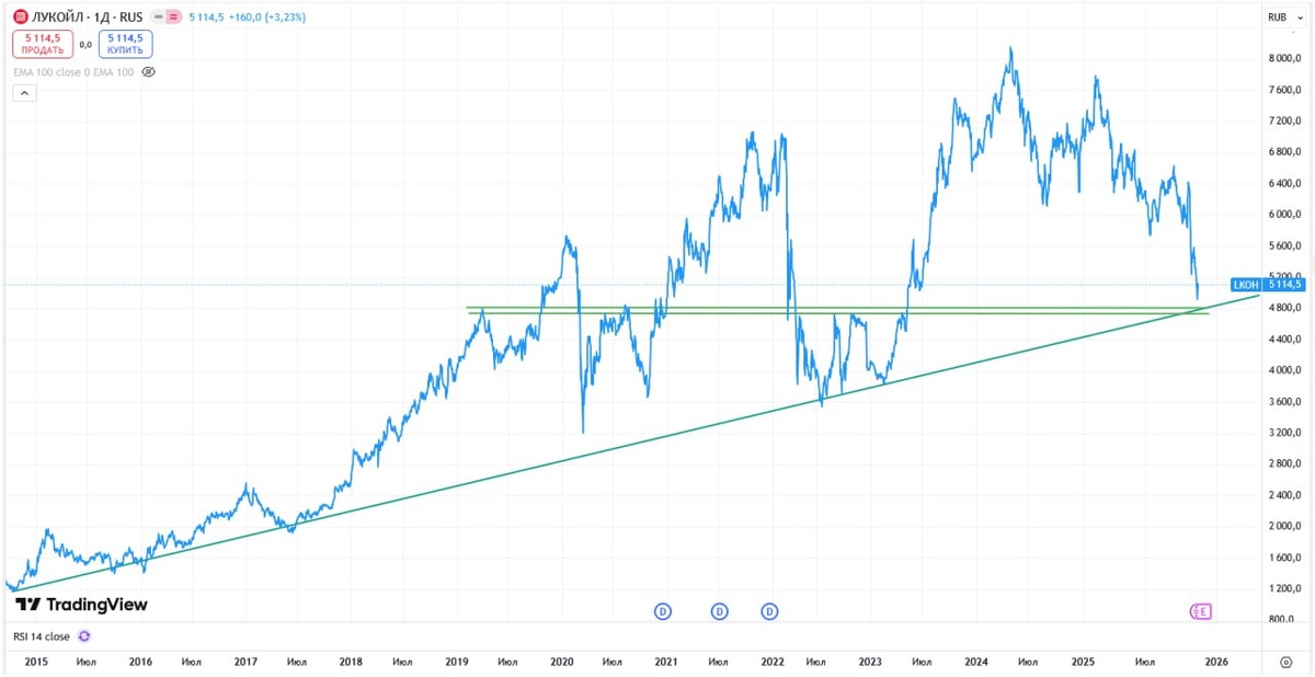 Немного недопадали до линии глобального тренда. Плюс там сильное сопротивление проходит. Так что если еще придет на 4800 руб, то вполне можно пособирать, кому нужен в долгосрок. Я свой Лукойл не скидывал. Средняя чуть выше текущих. Буду ли добирать? Не исключаю. #LKOH