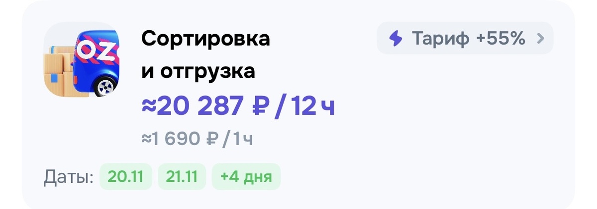Сегодня расскажу о самых лучших направлениях в Ozon Job, какие лучше выбирать, на чем можно больше заработать, что легче и составим топ лучших, отталкиваясь от своего личного опыта и своих коллег. Всего существует немалое количество направлений, на которые можно записаться на смену, в Ozon Job, сейчас разберем каждое из них: 1.Сортировка и отгрузка: За двенадцати часовую смену, озон обещает нам ~ 20287₽, а это: 1690₽ - 1 час работы. Стоит отметить, что это с повышенным (+55%) тарифом, но даже без «коэффициента», данное направление является одно из самых высокодоходных. Чтобы записаться на смену, стоит лишь пройти регистрацию в Ozon Job, подключить самозанятость и занять смену: Нажать кнопку «записаться». 2.Сортировка: Данное направление не предполагает собой отгрузку, только сортировку, средняя оплата, за 12 часовую смену — 16164₽, однако сразу отмечу, тут тариф (+35%), а это меньше на 20% предыдущего направления. Физическая сложность меньше, но и доход, как видите тоже. 3.Размещ