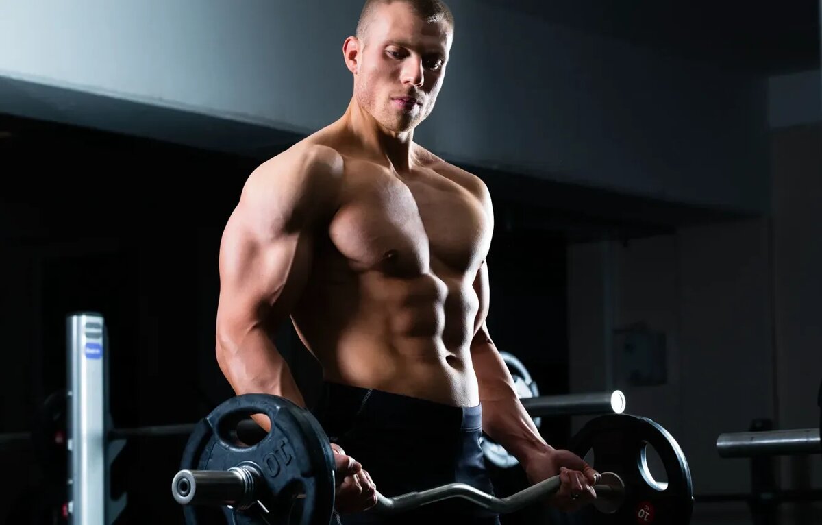 - Сгибания со штангой — 3 подхода × 10–12 повторений.