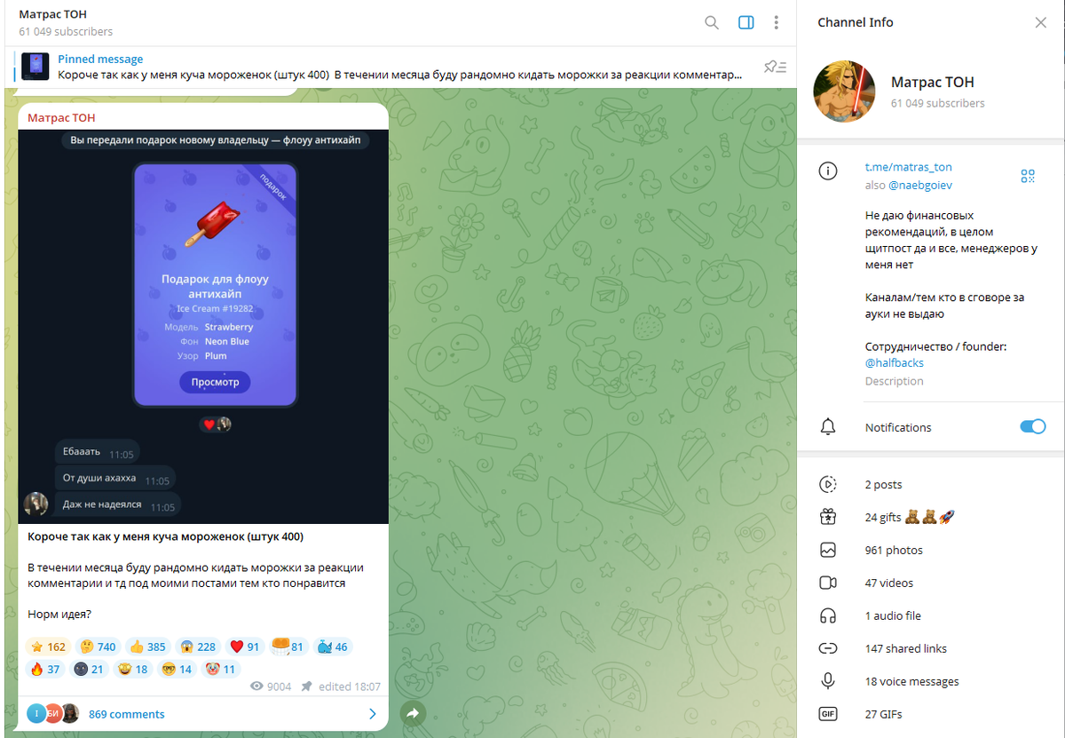 Это может указывать на накрутку и искусственный приток подписчиков. Сейчас на канале 61 000+ подписчиков, но даже закреп с раздачей «халявы» набрал всего 9 тысяч просмотров — классическая картина накрученной аудитории. Контент постепенно превратился в щитпост: автор высмеивает людей, потерявших деньги на NFT-подарках, и публикует сплошные мемы. Часто можно увидеть рекламу сторонних каналов — вероятно, это и есть основной доход проекта. Известно только, что канал ведёт пользователь @halfbacks.