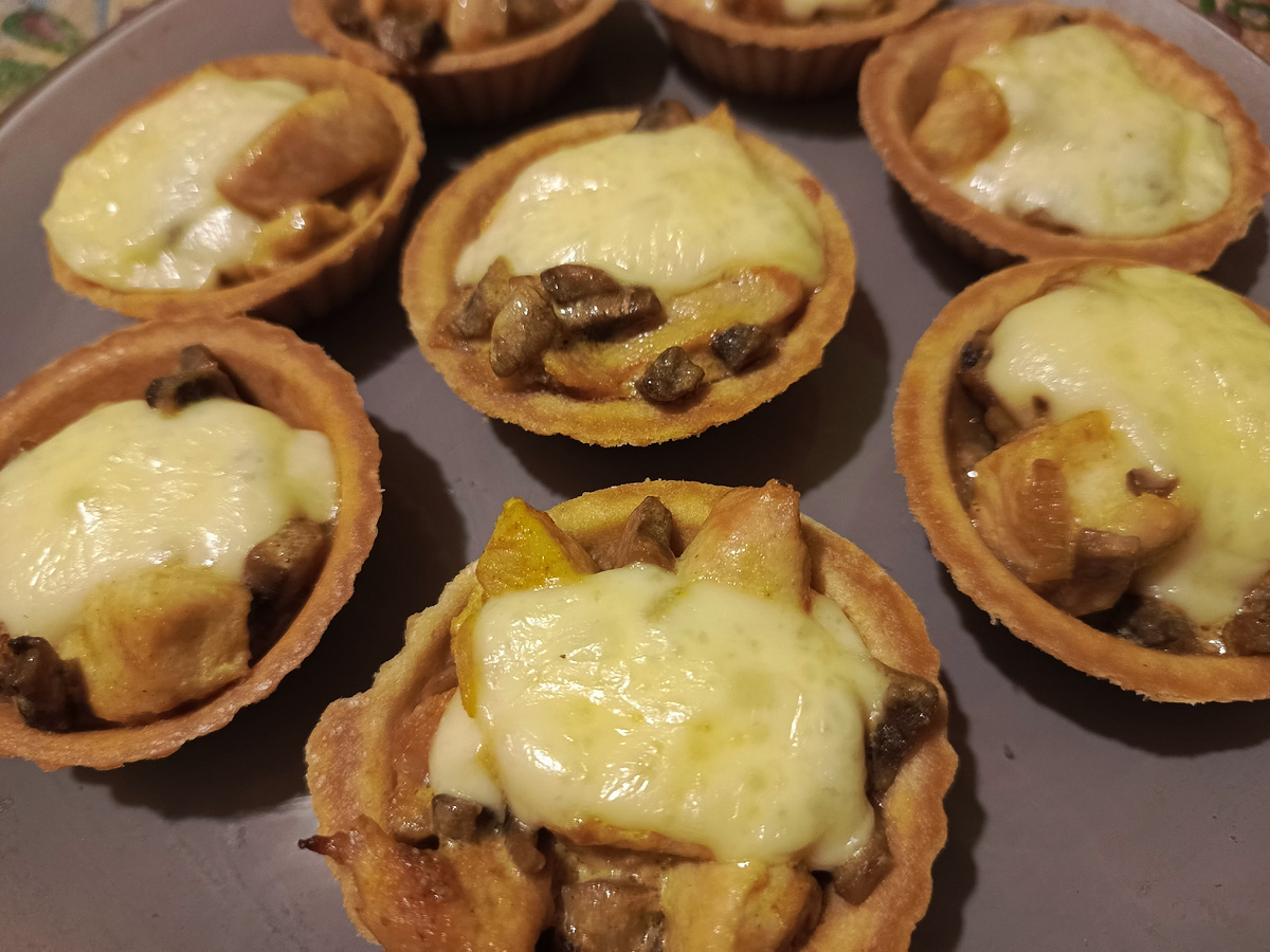 Режем кубиками куриное филе, шампиньоны и репчатый лук. Обжариваем лук и шампиньоны, добавляем к ним сливки. Солим, перчим. Затем отдельно обжариваем куриное филе. И добавляем его к грибам. Все перемешиваем. Наполняем этой начинкой тарталетки. Сверху посыпаем тертым сыром. Ставим тарталетки в духовку на 10-15 минут. Закуска готова!