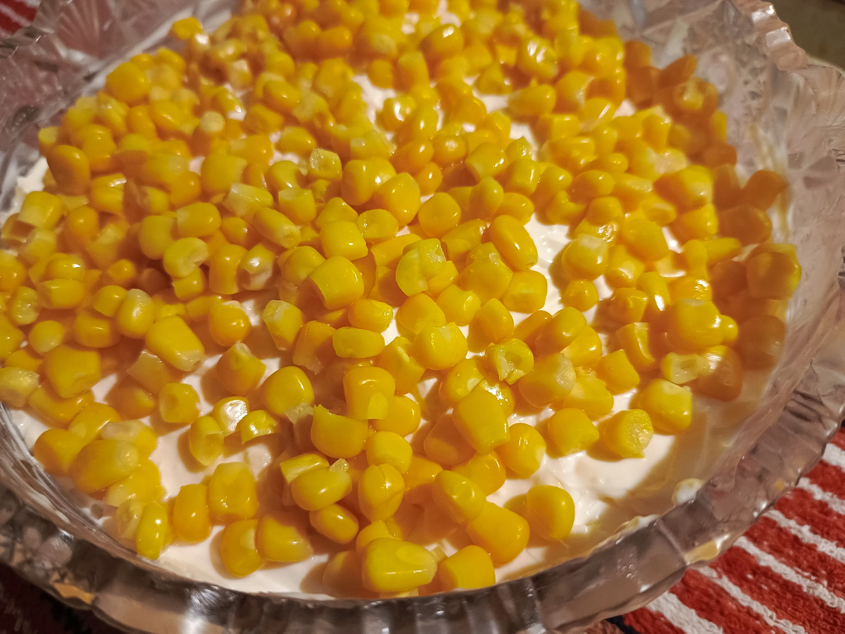 Слоеный вкусный салатик. Первый слой - крабовые палочки, нарезанные кубиками. Затем - сеточка из майонеза. Далее слой консервированной кукурузы, сеточка из майонеза. Затем слой тертый яиц и сеточка из майонеза, затем слой тертого сыра, сеточка из майонеза. Сверху выкладываем консервированную кукурузу.