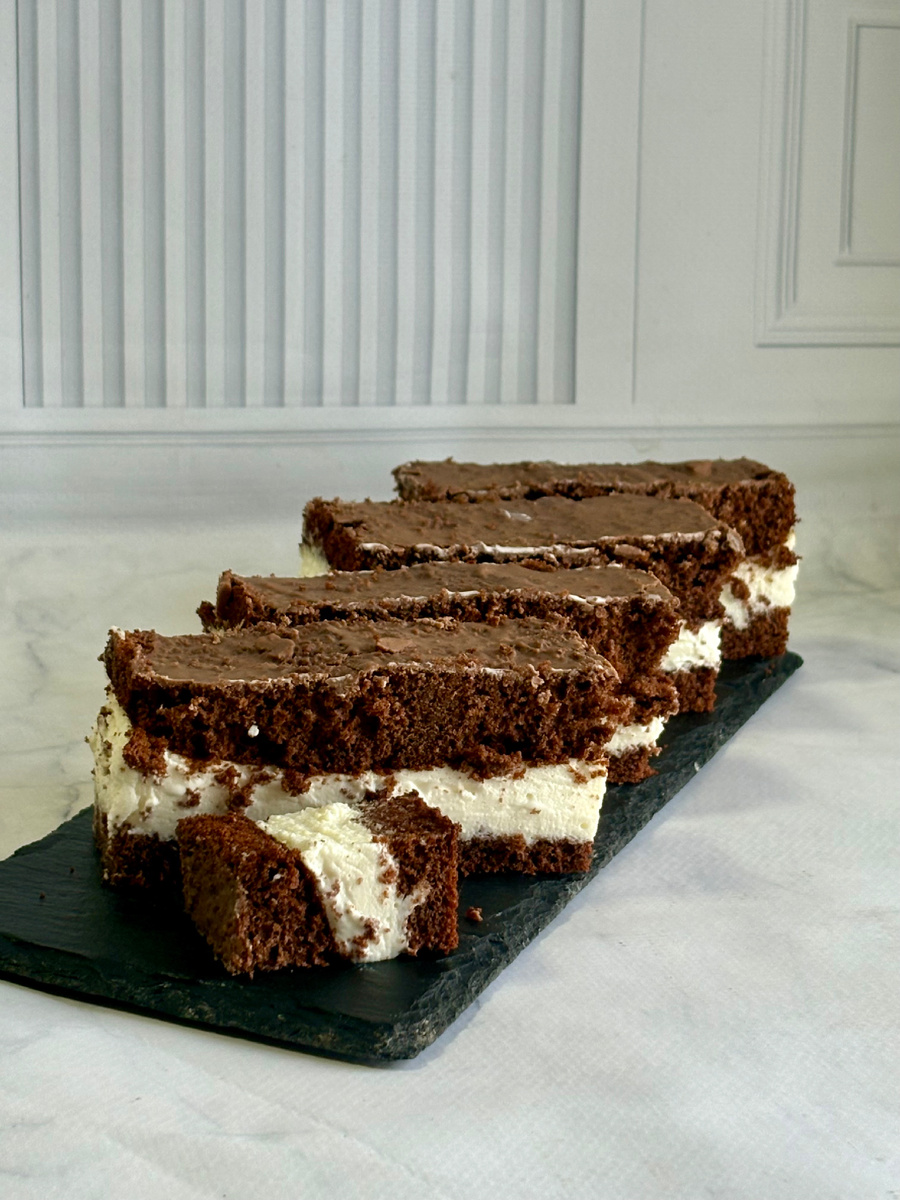 Пирожные молочный ломтик. Простой и вкусный десерт🎂 🧁Для бисквита: Яйца С1 - 3 шт Сахар - 140 г Мёд - 30 г (можно заменить глюкозным сиропом) Мука - 160 г Какао алкализованое - 40 г Разрыхлитель теста- 6 г Молоко - 130 г Масло подсолнечное - 50 г Все ингредиенты должны быть комнатной температуры. Яйца взбиваем с сахаром до пышности и посветления. Время зависит от миксера, примерно 5-10 минут. Сухие ингредиенты объединяем в отдельной посуде и перемешиваем венчиком (мука, какао, разрыхлитель). Молоко соединяем с растительным маслом. К яичной смеси в 2 этапа просеиваем сухие ингредиенты, вливаем молоко с маслом, перемешивая силиконовой лопаткой до полного объединения. Добавляем мед. Перемешиваем. Тесто готово. Дно квадратной формы застилаем фольгой. Переливаем тесто, разравниваем. Ставим в разогретую до 170 градусов духовку. Выпекаем до сухой шпажки. Ориентировочное время выпечки 20-25 минут. Готовый, остывший бисквит обернуть в пленку и оставить в холодильнике на 8 часов