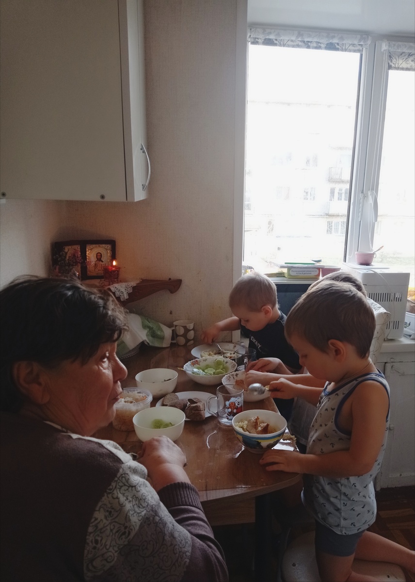 Старшие умеют молиться за едой, а вот Филиппушка сейчас этому учится.