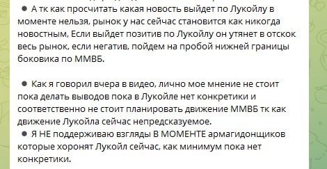 🆘По Лукойлу. ❗️Внимание на Скрин вчерашнего поста. ⏺Я писал что не стоит хоронить Лукойл БЕЗ какой либо конкретики и новости на которых нас сливали на неделе НЕ считал КОНКРЕТНЫМ негативом в моменте. ⏺В Понедельник Лукойл слили на новости об отмене покупки активов, в среду нас слили на новости ПРЕДПОЛОГАЕМОГО убытка если Активы не будут проданы. ⏺Я всю неделю писал что эти новости НЕ являются каким то конкретным негативом, могут продать, могут не продать, Может понести убытки может не понести. ⏺И глупо было писать что Лукойл уйдет на 3000 с учетом этих новостей что почти на 40% ниже текущей стоимости. ____________ ⏺Так же я писал что после объявление санкций Лукойл потерял более 20% и УЖЕ вложил в себя весь возможный негатив даже тот которого нет. ⏺И вот эти 2 новостных вброса в понедельник и среду ни как не являются конкретным каким то негативом. ⏺И тем более опираясь на эти вбросы НЕ ЛОГИЧНО было хоронить Лукойл и ТЕМ БОЛЕЕ писать конкретные уровни коррекции 3000 - 3500, тк как