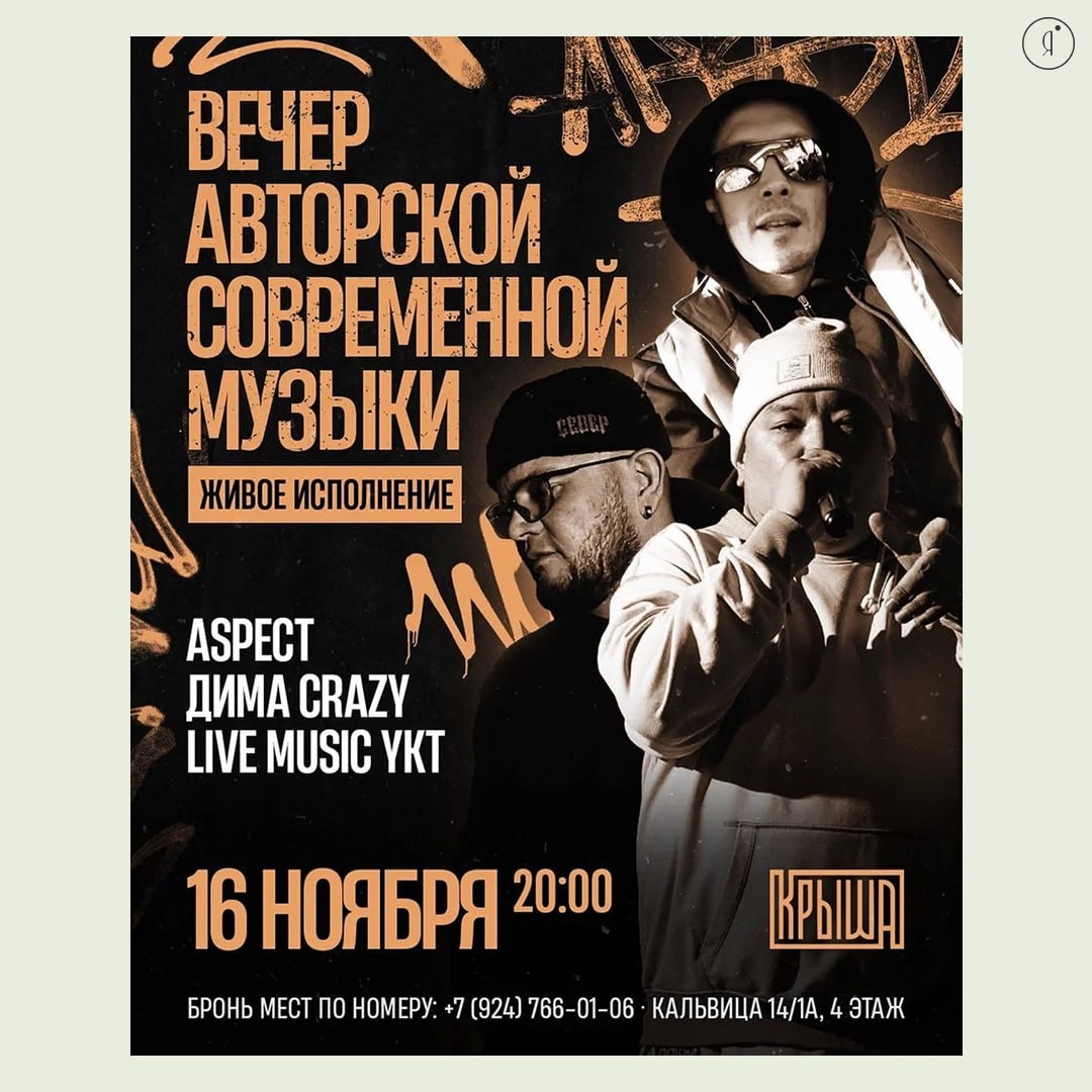 Вечер авторской современной музыки #Вечером #Концерты Глубокий саунд и атмосферные треки в живом исполнении ASPECT | DIMA CRAZY | LIVE MUSIK 16 ноября | 20:00 Крыша, Кальвица, 14/1а Справки и бронирование: 8 (924) 766-01-06 Online Якутия | Ждем вас в МАХ