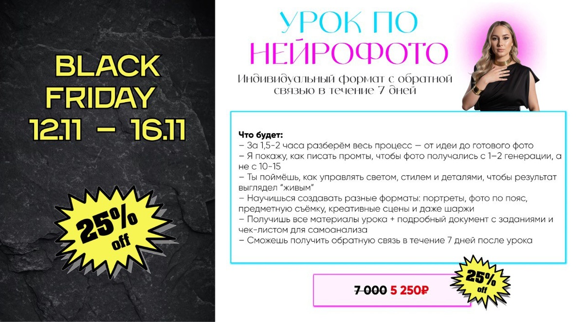 ЛОТ №4 ИНДИВИДУАЛЬНЫЙ УРОК ПО НЕЙРОФОТО Кому подойдёт: Тем, кто хочет научиться создавать реалистичные фото с помощью ИИ: портреты, предметку, сцены, креативы. Подойдёт блогерам, экспертам, предпринимателям, дизайнерам, а также тем, кто хочет получить уверенность в работе с визуальным контентом. Какие задачи решит: • поможет понять весь процесс создания нейрофото — от идеи до результата • научит писать промпты, которые дают хорошее фото с 1–2 попыток • разберёт, как управлять светом, стилем, деталями, чтобы фото выглядело “живым” • даст навыки создания разных форматов: от портретов до сложных сцен и даже шаржей • позволит закрепить материал через задания и самоанализ 📌 Вы получите материалы урока + подробный документ с заданиями и чек-листом. В течение недели сможете задавать вопросы и получать разбор ошибок — это закрепит навык и сделает результат стабильным. Промокод: ПЯТНИЦА 👉 ПРИОБРЕСТИ ЭТОТ ФОРМАТ