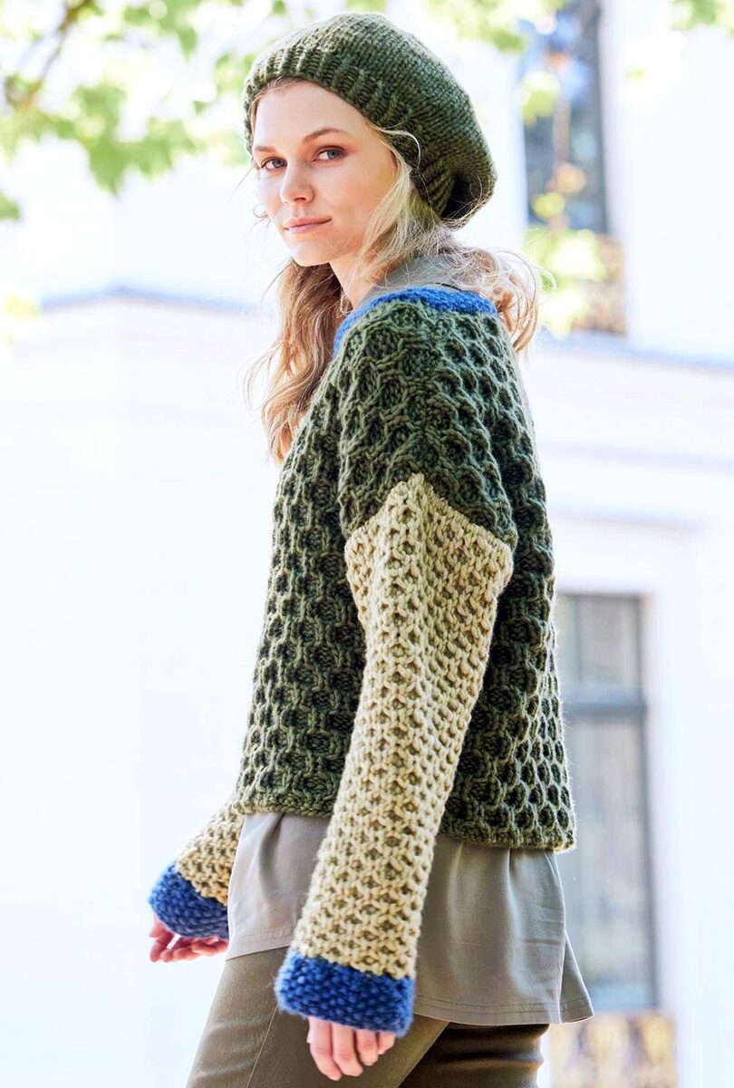 № 1: Болотно-зелёный берет и укороченный пуловер с контрастной отделкой и структурным узором «соты» ♥
