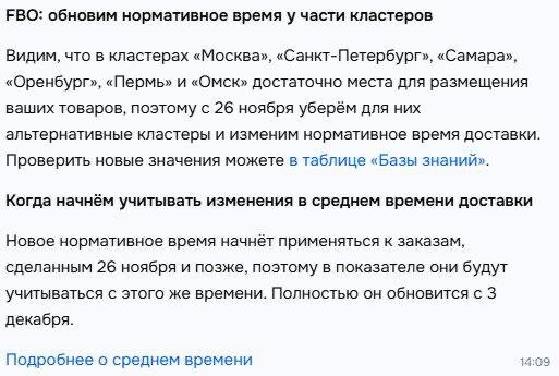 Ozon снова перетасовал нормативки по FBO — но хотя бы не «с сегодняшнего дня» С 26 ноября Ozon меняет нормативное время доставки для части кластеров. Из альтернативных кластеров убрали «Москва», «Питер», «Самара», «Оренбург», «Пермь» и «Омск» — там, как пишет площадка, «достаточно места». Главное — изменения вступают не мгновенно: новые нормативы начнут учитываться для заказов, сделанных с 26 ноября, а полностью данные обновятся 3 декабря. Хорошо, что не задним числом) Marketplace_biz - отдай свой буст каналу