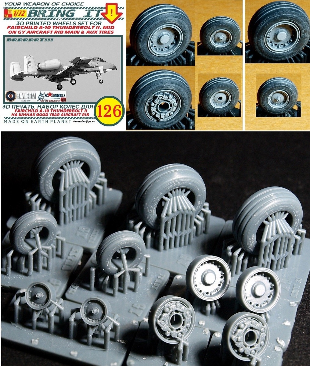 Bring It! из Уфы выпустила на 3D-принтере колеса шасси для моделей А-10 Thunderbolt II с 1983-84 по 2008-2010 годы в масштабе 1/72. Основные колеса с шинами Good Year Aircraft Rib 36x11 с асимметричным трехручьевым протектором и маркировками outboard/inboard по боковинам покрышек. Диски с двойным фланцем катаные от A.S.S.C. тормозные механизмы - их же. Передние колеса с шинами GYAR 24x7.7 с четырехручьевым протектором на диске от GY. Для возможности воспроизведения внешнего облика некоего полетавшего штурмовика в набор добавлены по одной основной и одной передней шине GYAR с восстановленным протектором. Атрибуты подобной процедуры присутствуют в виде кольцевой надписи с актуальными характеристиками шины по сопряжению боковин с протекторной частью.