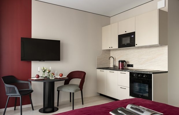 Эти советы помогут красиво и удобно организовать пространство маленькой квартиры Обустроить малогабаритное жилье стильно и современно — задача не из легких. Успешным примером служит студия 26,5 кв. м, созданная дизайнером Ольгой Кондрашовой. Она применила бюджетные оригинальные решения и превратила «бетонное» пространство в яркий и функциональный интерьер. Показываем 8 идей из этого проекта, которые, несомненно, заслуживают вашего внимания. Одним из ключевых приемов стал выбор единого цвета — оттенок «кашемир» для стен и всей корпусной мебели. Такой подход создает целостное восприятие пространства, делая его более воздушным и визуально расширяя границы. На таком нейтральном фоне легко добавлять яркие цвета и элементы декора, что позволит менять акценты по мере необходимости. Ольга решила добавить уникальности с помощью акцентной градиентной стены, которую она раскрасила самостоятельно. Этот творческий подход не только выделяет квартиру на фоне остальных, но и демонстрирует, как можно с
