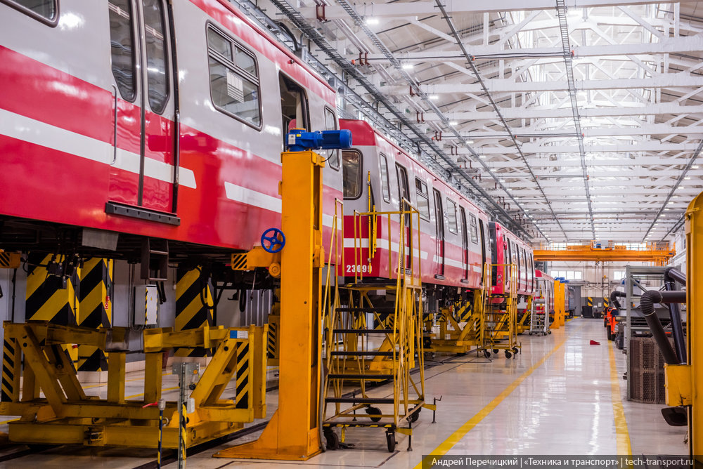 Это депо абсолютно не похоже на другие. Здесь нет собственных составов и внутри всё совершенно непривычно. Добро пожаловать в депо "Дачное" Петербургского метрополитена. Дачное находится совсем рядом с уже знакомым вам депо "Автово", между ними даже забора нет. В "Дачном" всего одни въездные ворота, что уже бьётся с привычными метродепо с отдельными воротами на каждую канаву. Более того - составы сюда заезжают не целиком, а отдельными вагонами. Всё потому что, фактически, "Дачное" это небольшой завод, занимающийся серьёзными видами ремонта, а не текущим обслуживанием. Вагон, заехав в депо, перемещается на трансбордере на нужную линию производства. Здесь есть линия ремонта новых типов вагонов с асинхронными двигателями, линии среднего и капитального ремонта для более старых моделей вагонов и множество других площадок. Вагон заезжает на нужную линию и с ним начинают работать, в зависимости от задачи. Могут даже до практически голого кузова разобрать (если нужно). Отдельные манипуляци