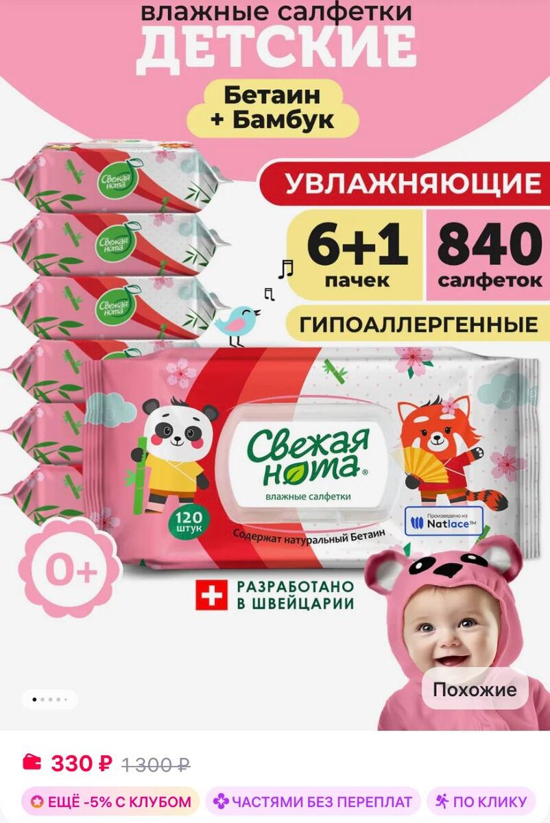 СВЕЖАЯ НОТА Влажные салфетки для детей увлажняющие 7х120 840шт Бетаин https://www.wildberries.ru/catalog/504333637/detail.aspx?size=700199210 Цена на 🛍: 330 ₽ | 1300 ₽ рейтинг: 4.9⭐️ выгодная цена 💲 ✅ Подписаться 🔣 Бот с промокодами