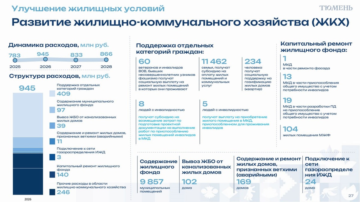 Бюджет Тюмени: горожане задают вопросы Во время публичного обсуждения проекта бюджета Тюмени на 2026 год и на плановый период 2027 и 2028 годов горожане активно задавали вопросы. Например, Татьяну заинтересовала тема обеспечения доступности для инвалидов жилых помещений и мест общего пользования в многоквартирных домах. Заместитель главы Тюмени Александр Ильин, отвечая, пояснил: - В своё время администрация города Тюмени взяла на себя расходные обязательства по субсидированию управляющим организациям расходов, связанных с разработкой проектной документации и выполнением работ по приспособлению жилых помещений, в которых проживают инвалиды, входных групп и подъездов для удобства инвалидов. Эта работа ведётся не первый год и будет продолжена. При этом мы столкнулись с тем, что не во всех многоквартирных домах технически можно провести такие работы. В этой связи в бюджет следующего года было заложено ещё одно расходное обязательство в этой сфере. Подробности