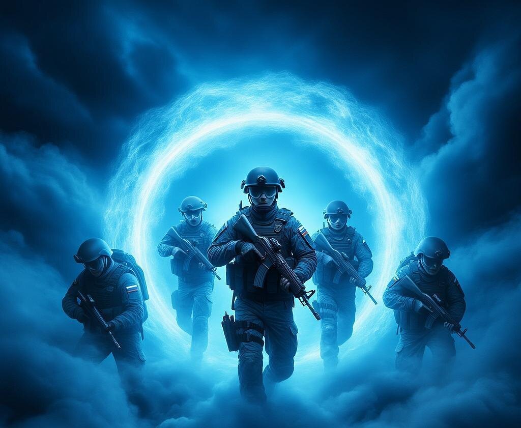 Ученый нажал кнопку, и в воздухе появилось сияющее отверстие. Спецназовцы двинулись вперед, пересекая границу времен.