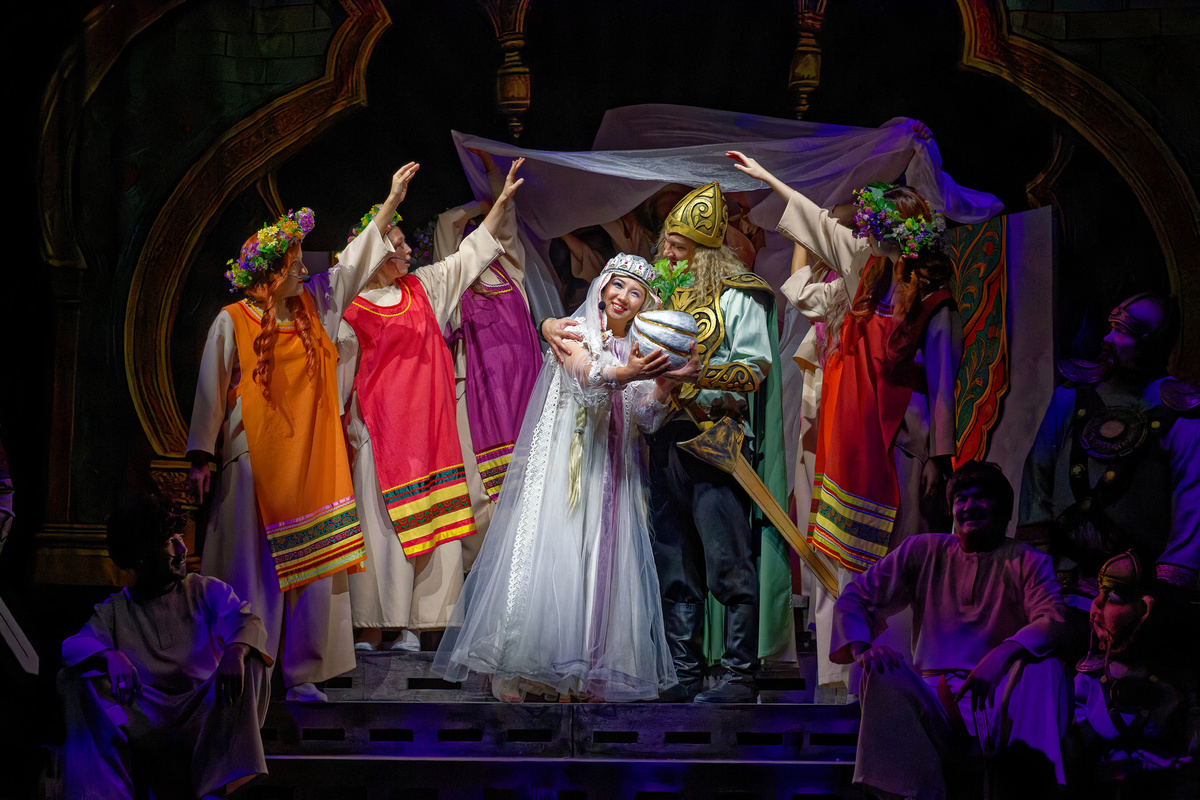 Актеры театра кукол, которых зрители знают преимущественно в качестве «голосов» из-за ширмы, все чаще выходят на сцену в «живом плане» и, похоже, вошли во вкус. А колдунья Наина (Гузель Мухамедьянова) и волшебник Финн (Максим Иванов) вообще лишены кукольного воплощения, их история, кстати, получила неожиданный хеппи-энд. Все без исключения образы колоритные и запоминающиеся: например, непутевый Фарлаф в исполнении талантливого комика Сергея Булки и грозный Рогдай Вадима Габидуллина, яркая и неоднозначная Наина и мужественный Финн.