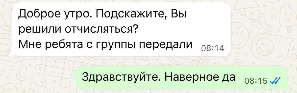 Сегодня утром мне пришло сообщение, которое заставило меня окончательно принять ситуацию. Трепать нервы себе и близким бесполезно. Если ничего нельзя изменить, значит надо принимать, даже если это совсем не просто. Выбирал направление в обучении, будущую профессию Артём сам. И его решение не было неожиданным. Ему действительно такого рода деятельность всегда нравилась. Пару недель назад он стал пропускать занятия. «Ему учиться надо, а у него одни девки на уме…» - негодовала бабушка. И говорила я с ним, а он не очень-то и слушал… «Да, хотел учиться, а теперь вот не хочу» Ещё вчера говорила с мамой по телефону. Когда спросила про сына и учёбу, мама не захотела говорить, чтобы не нервничать. Настораживает. Чтобы наша бабушка сдалась и не говорила про то, как необходимо получить образование… У меня ещё оставалась надежда. Есть такой переломный момент, когда ожидание и реальность расходятся. Обучение есть обучение. У многих этот переломный момент проходит. Не прошел. Грустно как-то, но ми