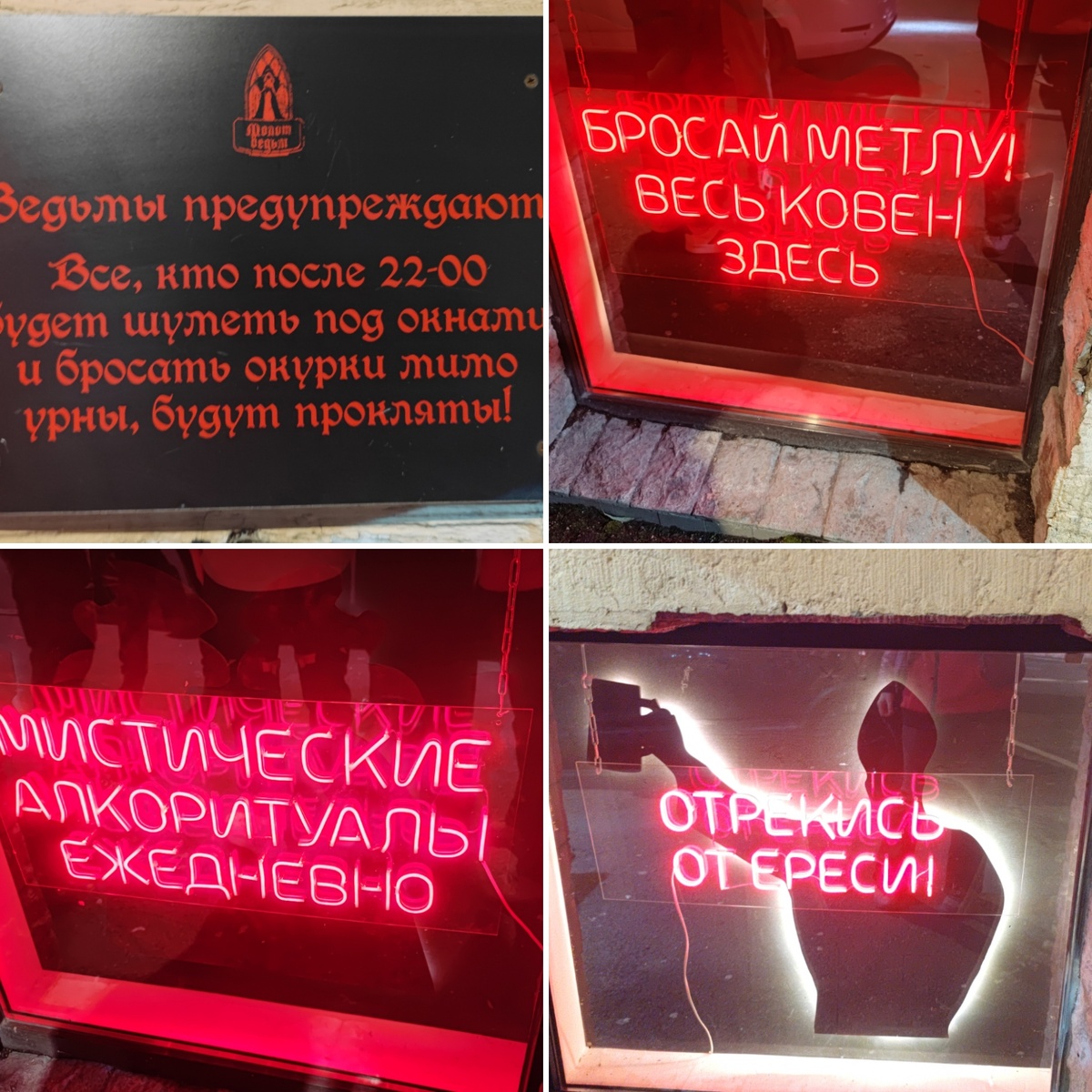 Молот Ведьм — атмосферный бар‑музей в Питере, куда не так просто попасть: столики бронируются заранее, и многое зависит от случая. Мы успели выцепить место только в Мистической гостиной. При входе официантка — она же проводница — холодно поговорила: в другие залы ходить нельзя, иначе, сказала она с невозмутимой улыбкой, можно нарваться на проклятие. Бар расположен будто в подполье: узкая лестница, железная дверь с выточенными рунными знаками, приглушённый свет свечей и запахи горящих трав и выдержанного алкоголя. Там не ты выбираешь коктейль — коктейль выбирает тебя. Вместо меню предлагают колоду карт: потёртые карты с магическими символами лежат на барной стойке. Лёгким взмахом руки и в надежде на судьбу берёшь карту — и ведьмы наколдовывают именно то зелье, что ей соответствует. Ритуал прост и одновременно тревожен: шёпот заклинаний, лёгкий дым, и в бокале вспыхивает другой свет. Мы успели попробовать только четыре зелья, но за соседними столиками можно было наблюдать подачу и сцену