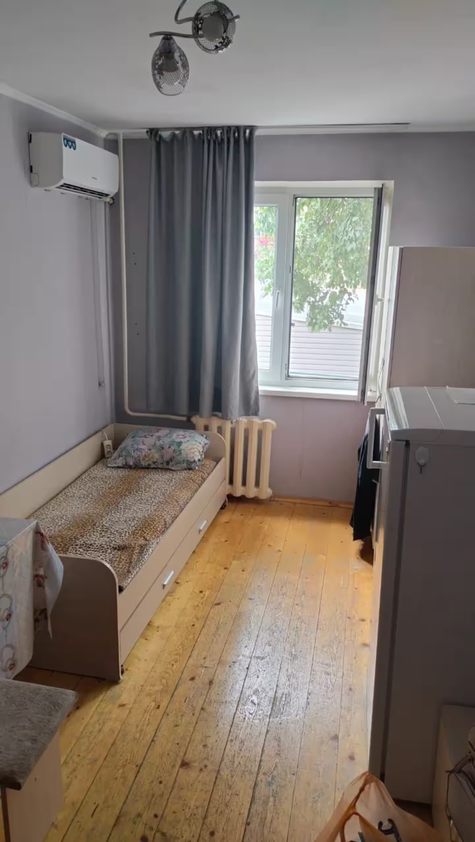 На днях знакомая скинула объявление о квартире в центре города за 110 тысяч рублей. Открыла фотографии и поняла: это не квартира, это тетрис из мебели, где каждый предмет борется за своё место под солнцем. Знакомая Лена спросила моё мнение, стоит ли снимать. Ответ простой: если ты готова завтракать рядом с холодильником, спать рядом с обеденным столом, то да, вперёд. Спальная зона Именно зона, потому что полноценной спальней это назвать язык не поворачивается! Заходишь в комнату и видишь диван бежевого цвета, прижатый к стене. Под диваном выдвигается ещё одна кровать, как матрёшка, только менее праздничная. Над диваном висит металлическая декоративная люстра, которая пытается добавить шика, но на фоне серых стен выглядит как украшение на торте из столовой. Стены свежеокрашенные, серые, ровные, без души. Старая чугунная батарея под окном покрашена белой краской, будто её вытащили из музея советского быта и решили оставить для колорита. Деревянный пол, местами потёртый, блестит не от но
