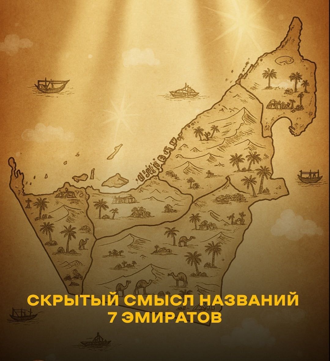 🏙 Скрытый смысл названий 7 эмиратов ОАЭ то, о чём знают не все Каждый эмират в ОАЭ это не просто название на карте. За каждым словом скрыта история, культура, символы и характер народа, который жил здесь задолго до небоскрёбов и мегапроектов. Сегодня расскажу, что на самом деле означают названия всех семи эмиратов и вы посмотрите на ОАЭ совершенно по-другому. ✨ Dubai «двигаться / течь» Название произошло от слова «даба». Так когда-то называли русло Дубай-Крик — реки, которая дала начало торговле и развитию города. Сегодня Дубай сердце региона и мировой центр бизнеса, технологий и инвестиций. ✨ Fujairah «рассвет» От слова «фаджр» первый утренний свет. Эмират окружён горами, и именно здесь раньше всех в стране восходило солнце. Символ надежды, нового дня и обновления. ✨ Umm Al Quwain «мать двух сил» Название связано с морской традицией. Море и стойкость жителей, живших рыбалкой и нырянием, всегда были двумя главными силами, дающими жизнь этому эмирату. ✨ Ras Al Khaimah «мыс