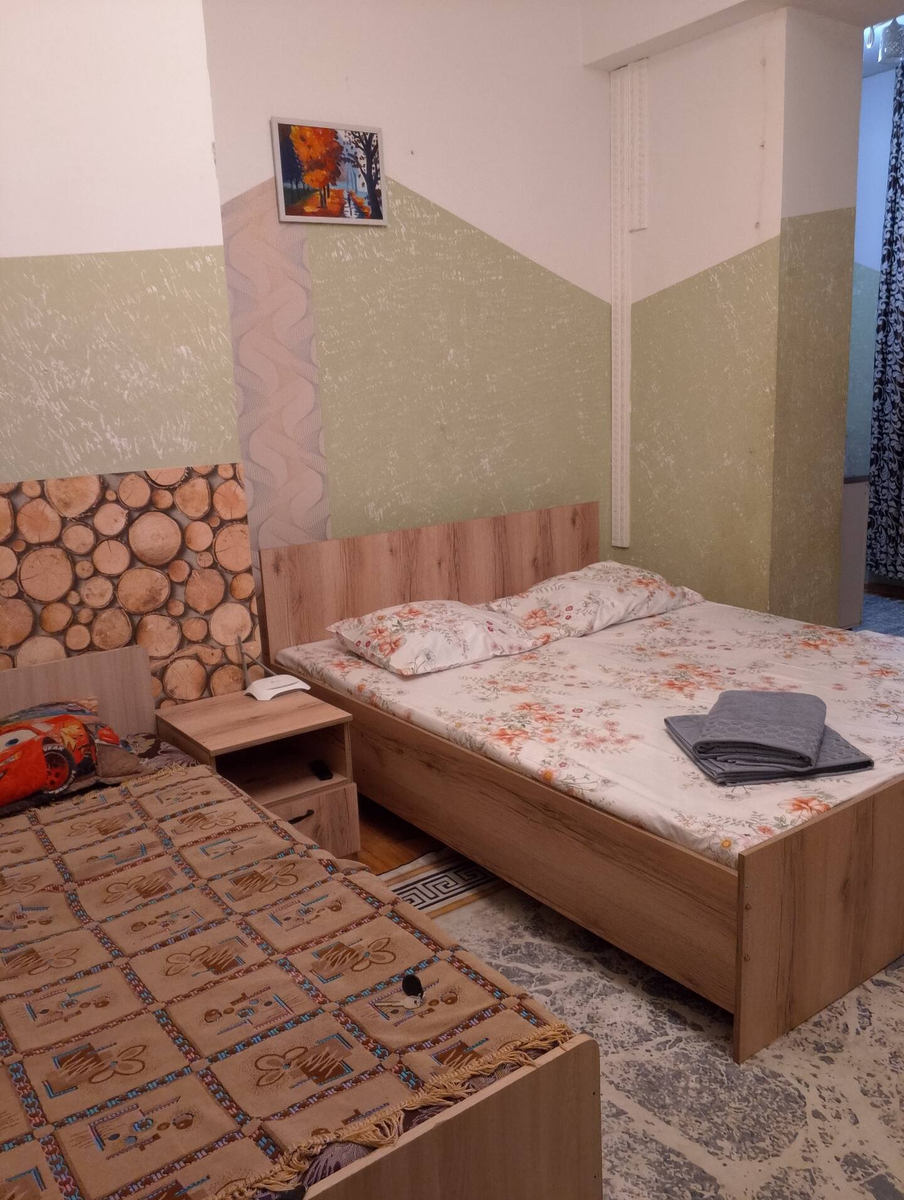 Всем привет, мои дорогие! Если хочется мощных эмоций и полного отключения логики, то эта квартира, как сборник дизайнерских мемов, поможет вам прочувствовать эти ощущения. Внутри всё настолько неожиданно и самобытно, что хочется сфотографировать каждый угол. Спальня: комбо-стилистика и вечные вопросы Заходишь — и сразу вспоминаешь детство: кровати с покрывалами «как у бабушки», простынь в цветочек, деревянные тумбы. Стены расписаны волнистыми оливковыми и белыми зонами, словно автор вдохновлялся горами или абстракцией, но на полпути решил добавить фактуру «под короед» и отрезать кусочек берёзовой рощи в виде 3D-панели. Рядом — кирпичный угол, чтобы был «акцент». На стене висит картина осени, которая наконец привносит хоть какую-то эмоцию. Шкаф с зеркалом контролирует всё происходящее, телевизор смотрит вниз, ведя прямую трансляцию в мир кабеля, а под ногами — ковер в греческом стиле, будто напоминание о древних философах, которых тоска по уюту довела до мифа. Обеденная зона и кухня: ф